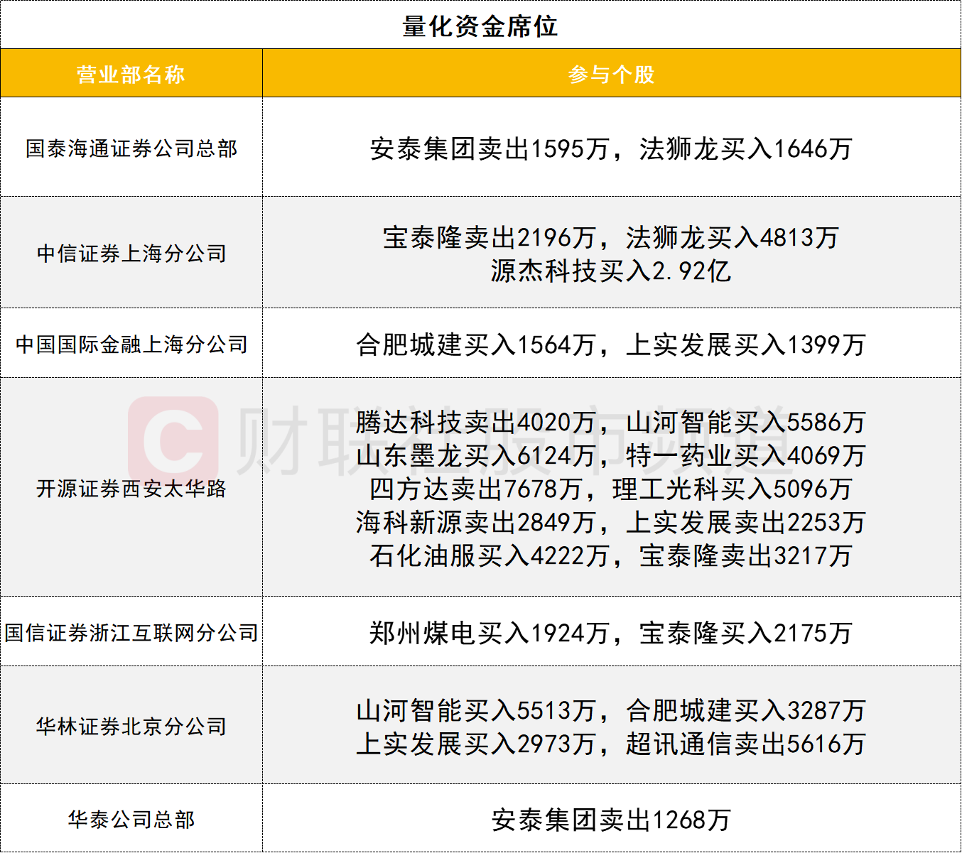 量化资金活跃度较高,源杰科技获中信证券上海分公司买入2.92亿。宝泰隆获一家量化席位买入2175万,同时遭两家量化席位合计卖出5413万。