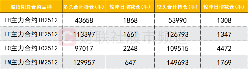 四大期指主力合约中,IH、IF、IC、IM合约多空双方均加仓,IC合约空头加仓数量较多。