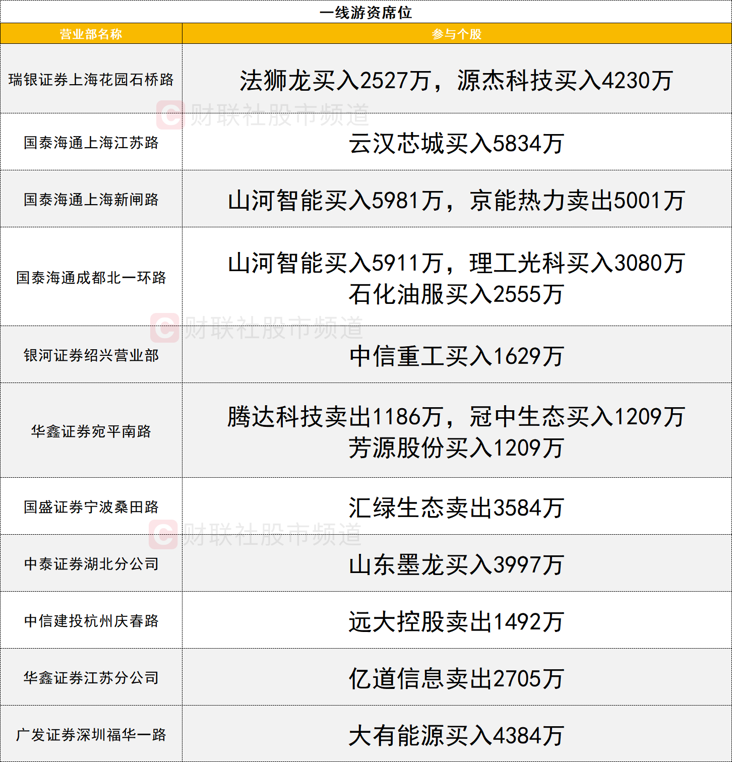 一线游资活跃度有所下降,山河智能获两家一线游资合计买入1.1亿。汇绿生态遭一家一线游资卖出3584万。大有能源获一家一线游资买入4384万。