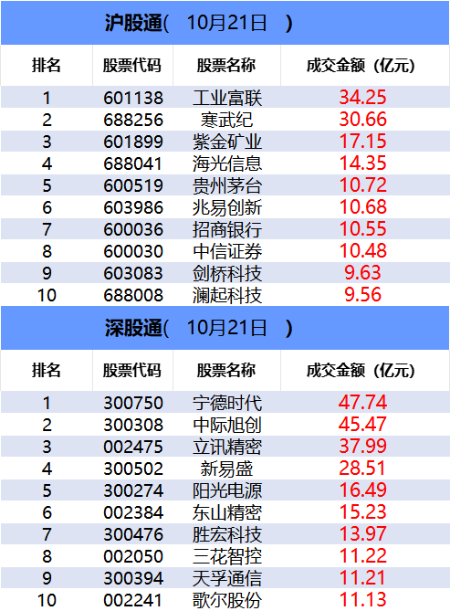 从沪股通前十大成交个股来看,工业富联位居首位;寒武纪和紫金矿业分居二、三位。