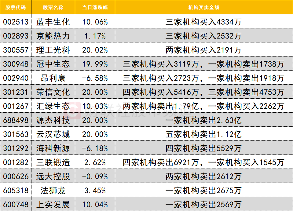 今日龙虎榜机构活跃度有所下降,买入方面,今日涨停的蓝丰生化获三家机构买入4334万。