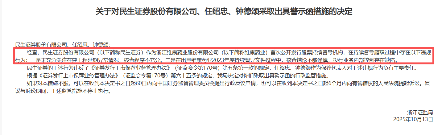 民生证券10月21日收到的警示函,与维康药业7月10日收到的行政处罚决定书存在直接且紧密的关联。二者本质上是监管层对“维康药业信息披露违法案”全链条追责的两个关键环节,前者聚焦中介机构(民生证券)的持续督导失职,后者针对上市公司(维康药业)及相关责任人的违法主体行为,共同构成“发行人违法+中介失职”的完整监管闭环。