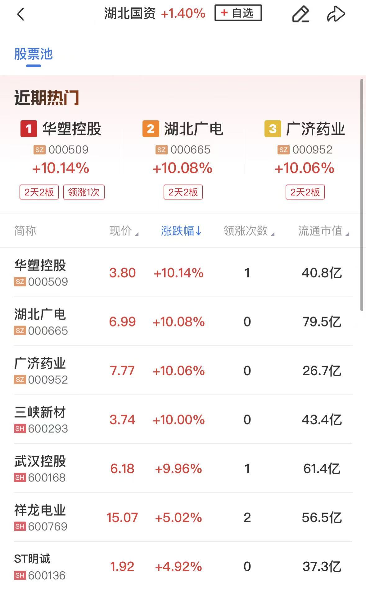 湖北国资概念延续强势,武汉控股、湖北广电、广济药业、三峡新材涨停,汇绿生态、百川能源、恒立钻具等涨幅居前。