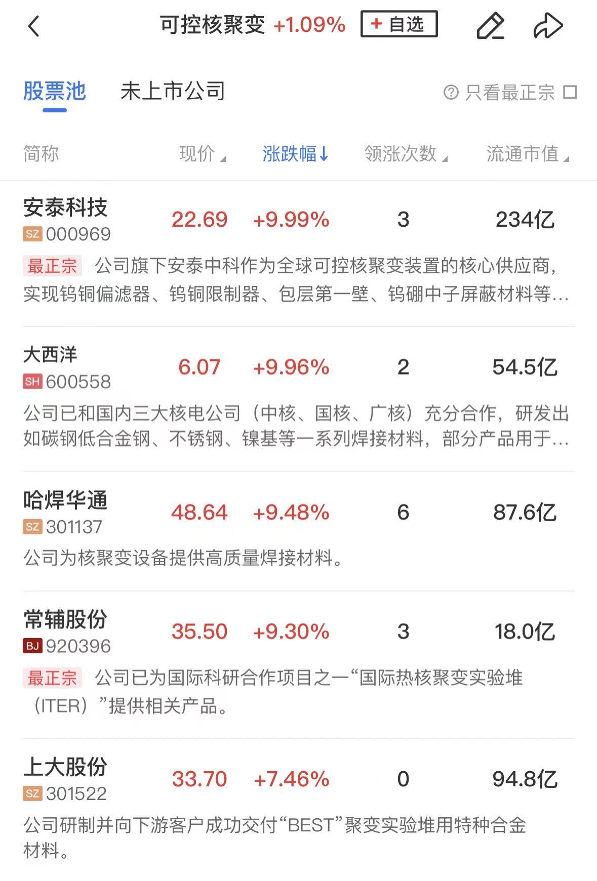 可控核聚变概念于盘中震荡走强,安泰科技、大西洋双双涨停,哈焊华通、常辅股份、上大股份、合锻智能等个股涨幅居前。