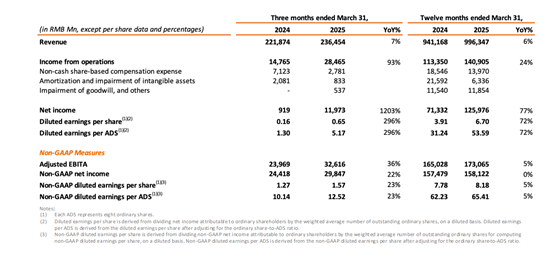 经历两年的结构调整后,阿里的核心电商业务重新回到增长轨道。2025财年收入同比增长6%,经营利润增长24%,淘宝客户管理收入提升12%。即时零售淘即得增强了交易频率,高德地图与饿了么形成流量协同,使本地生活和广告业务的收入质量大幅改善。
