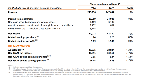 在2025财年第一季度(截至2024年6月30日),阿里巴巴集团实现营收 2,484.2 亿元人民币,同比增长 4%,略低于市场预期;调整后净利润为 460.8 亿元,同比增长 10%。核心电商业务仍是主要支撑,淘宝天猫集团收入 1,145 亿元,同比增长 4%,得益于用户活跃度上升和广告投放的稳步恢复。阿里云智能集团收入277亿元,同比增长3%,虽然增速放缓,但受益于 AI 训练与推理需求的提升,公共云及企业解决方案业务持续增长。国际数字商业集团(包括 Lazada、AliExpress、Trendyol 等)实现收入 286 亿元,同比增长 36%,成为集团最快增长板块,反映出阿里在全球电商市场的扩张势头。菜鸟物流收入 261 亿元,同比增长 8%,国际物流服务需求回升推动了增长。总体而言,虽然国内消费复苏力度有限,但国际业务与云计算的稳健表现使得阿里巴巴在复杂的宏观环境中维持了盈利增长。