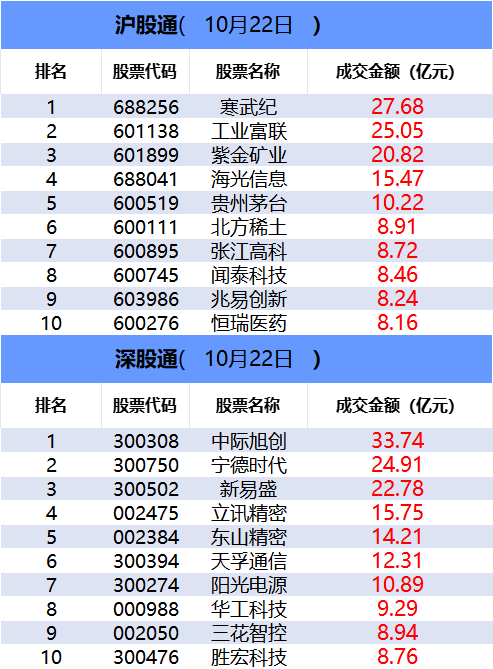从沪股通前十大成交个股来看,寒武纪位居首位;工业富联和紫金矿业分居二、三位。
