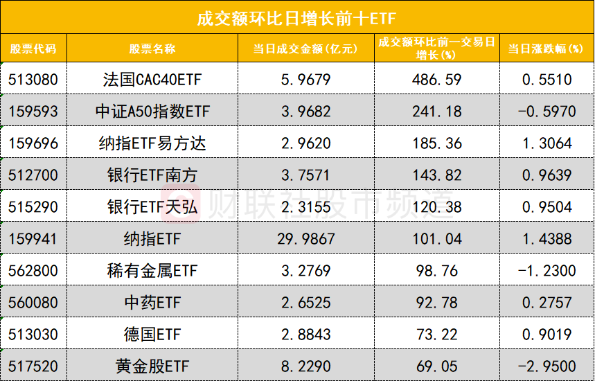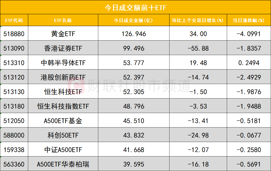 从成交额前十的ETF来看,黄金ETF(518880)成交额位居首位,香港证券ETF(513090)成交额位居次席。