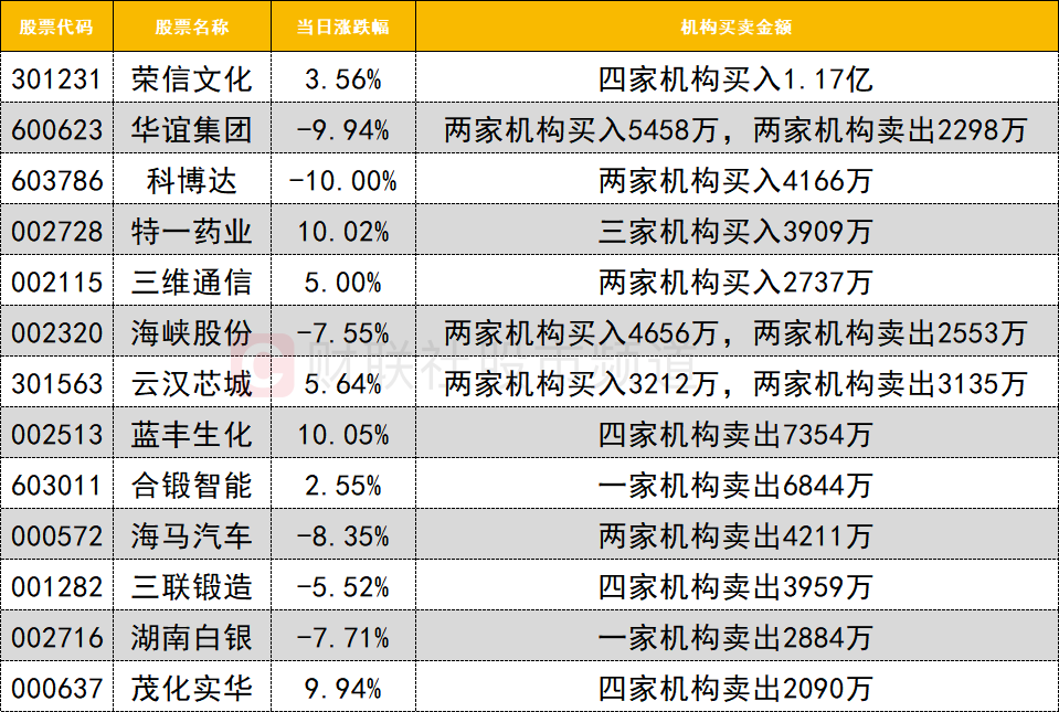 卖出方面,涨停的蓝丰生化遭四家机构卖出7354万。可控核聚变人气股合锻智能遭一家机构卖出6844万。