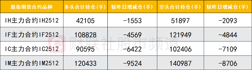 四大期指主力合约中,IH、IF、IC、IM合约多空双方均减仓,IH、IF、IC合约空头减仓数量均较多。