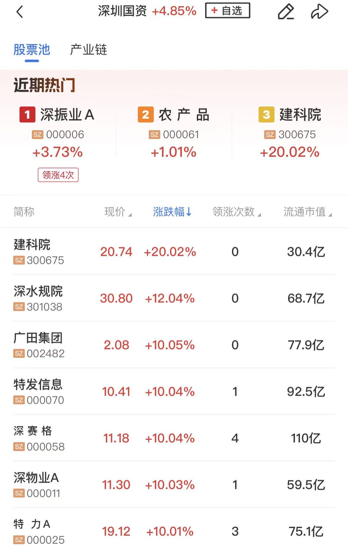 板块上,深圳本地股涨幅居前,建科院、特发信息、特力A、深赛格、中新赛克、深纺织A、深圳能源等个股涨停。