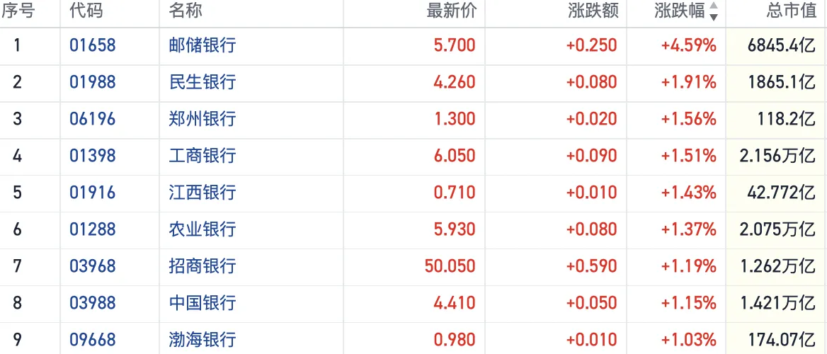 截至发稿,邮储银行(01658.HK)涨超4%,工商银行(01398.HK)等国有大行也均明显跟涨。农业银行(01288.HK)短线更是强势11连涨,盘中再创历史新高。