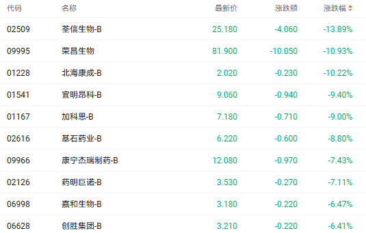 截至收盘,荣昌生物(09995.HK)、宜明昂科-B(01541.HK)、加科思-B(01167.HK)分别下跌10.93%、9.40%、9%。