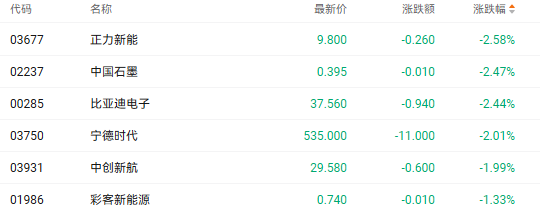 截至收盘,比亚迪电子(00285.HK)、宁德时代(03750.HK)、中创新航(03931.HK)分别下跌2.44%、2.01%、1.99%。