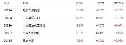 截至收盘,延长石油国际(00346.HK)、中国海洋石油(00883.HK)、中国石油股份(00857.HK)分别上涨6.10%、2.15%、1.52%。