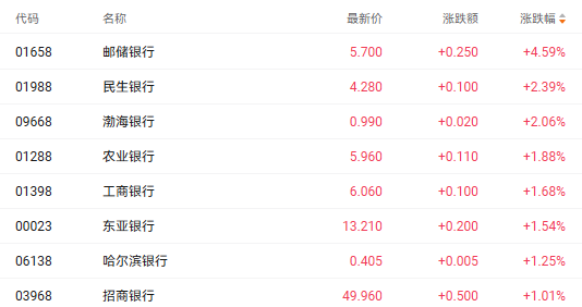 截至收盘,邮储银行(01658.HK)、农业银行(01288.HK)、工商银行(01398.HK)分别上涨4.59%、1.88%、1.68%。