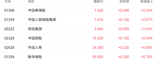 保险股同样受益于资金对于红利股的追捧。截至收盘,中国人民保险集团(01339.HK)、中国财险(02328.HK)、保诚(02378.HK)分别上涨2.07%、0.94%、0.38%。