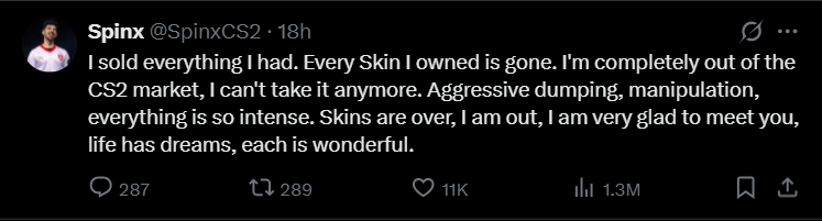 面对崩盘,甚至有《CS2》职业选手选择恐慌性出逃。昨日MOUZ战队选手Spinx发文称:“我卖掉了所有东西,我退出CS2市场。疯狂的抛售与操纵,一切都太夸张了。”