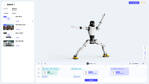 智元机器人还在灵创平台中,集成了动作混剪、组合与故事线编排功能。用户可借助该功能,像剪辑视频一样对机器人的声音、动作与表情进行多轨道编排,并能够逐帧调整动作节奏,以生成流畅衔接的连续动作序列。