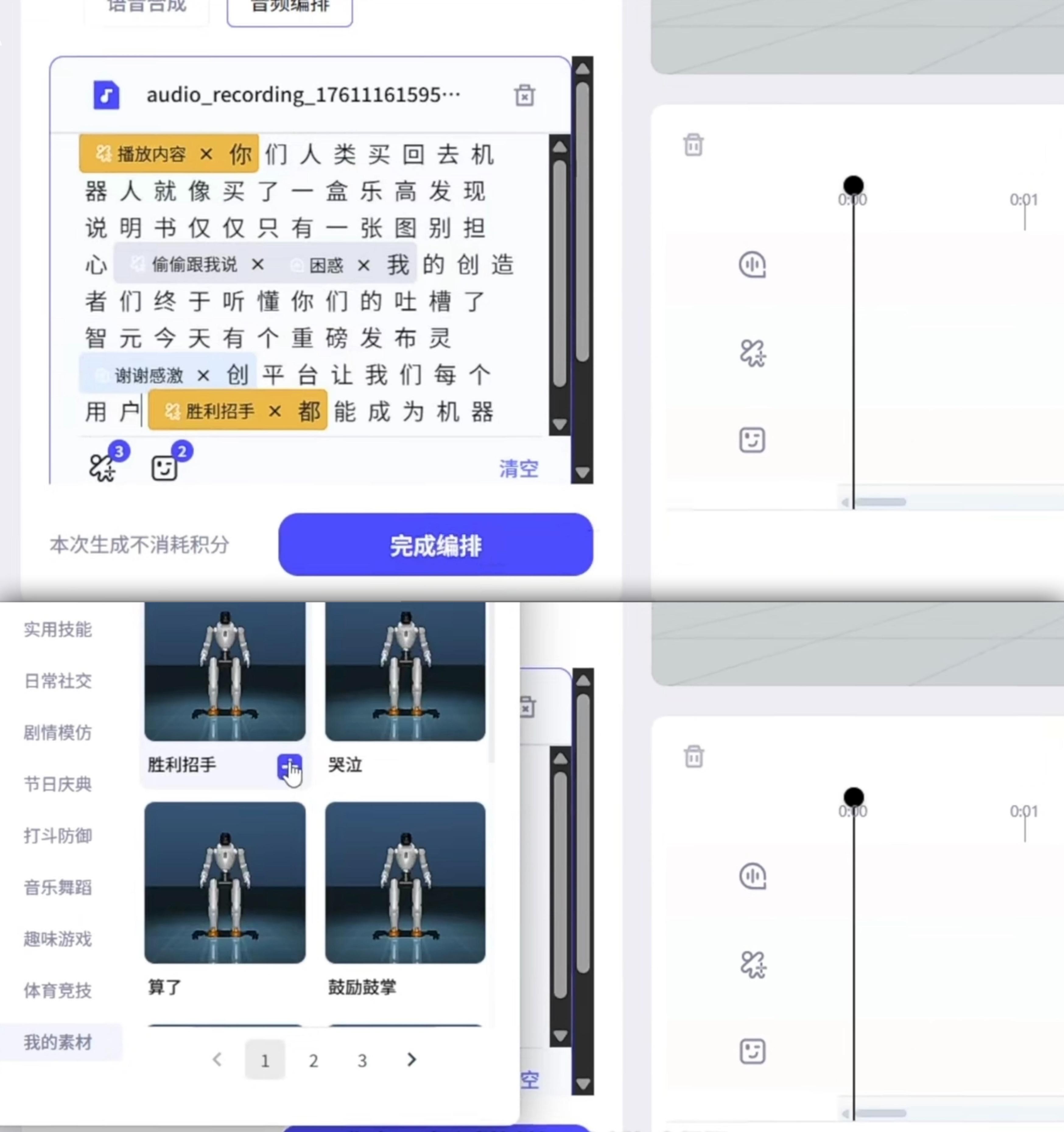 此外,灵创平台还提供“语音演绎”功能,包含音频上传、在线录音和语音合成三种模式。用户上传文本内容或音频后,该功能能够智能识别语义,并利用多模态大模型生成与语音内容匹配的机器人肢体动作与表情。用户还可以根据自身需求,自由选择系统提供的男性、女性以及自定义音色类型。