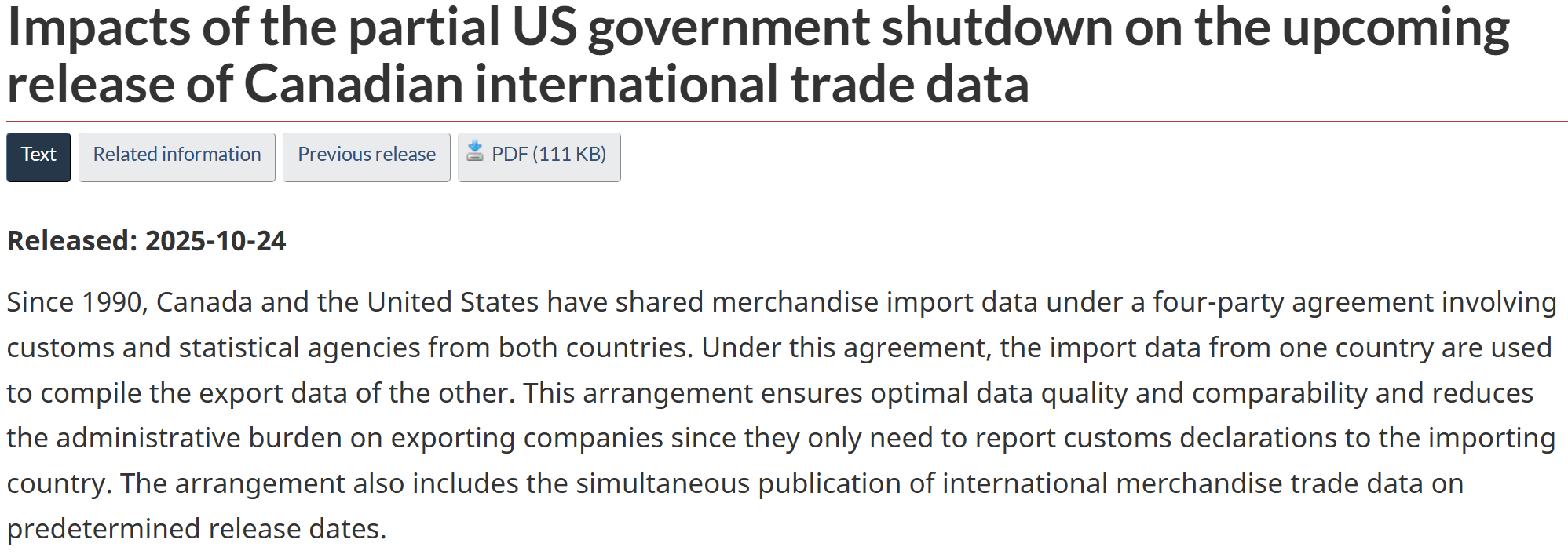 回到最初的贸易数据问题,加拿大统计局表示,目前先暂时停发加拿大的月度贸易数据,但如果美国政府停摆的时间持续延长,届时可能会考虑其他选项。