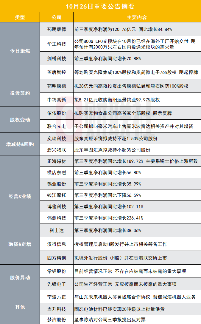 常铝股份(002160.SZ)公告称,公司股票连续三个交易日收盘价格涨幅偏离值累计超过20%,属于股票交易异常波动情况。经核实,公司前期披露的信息不存在需要更正、补充之处,近期公司经营情况及内外部经营环境未发生重大变化,公司、控股股东和实际控制人不存在关于本公司的应披露而未披露的重大事项。公司将于10月31日披露三季度报告,不存在需披露相关业绩预告的情形。