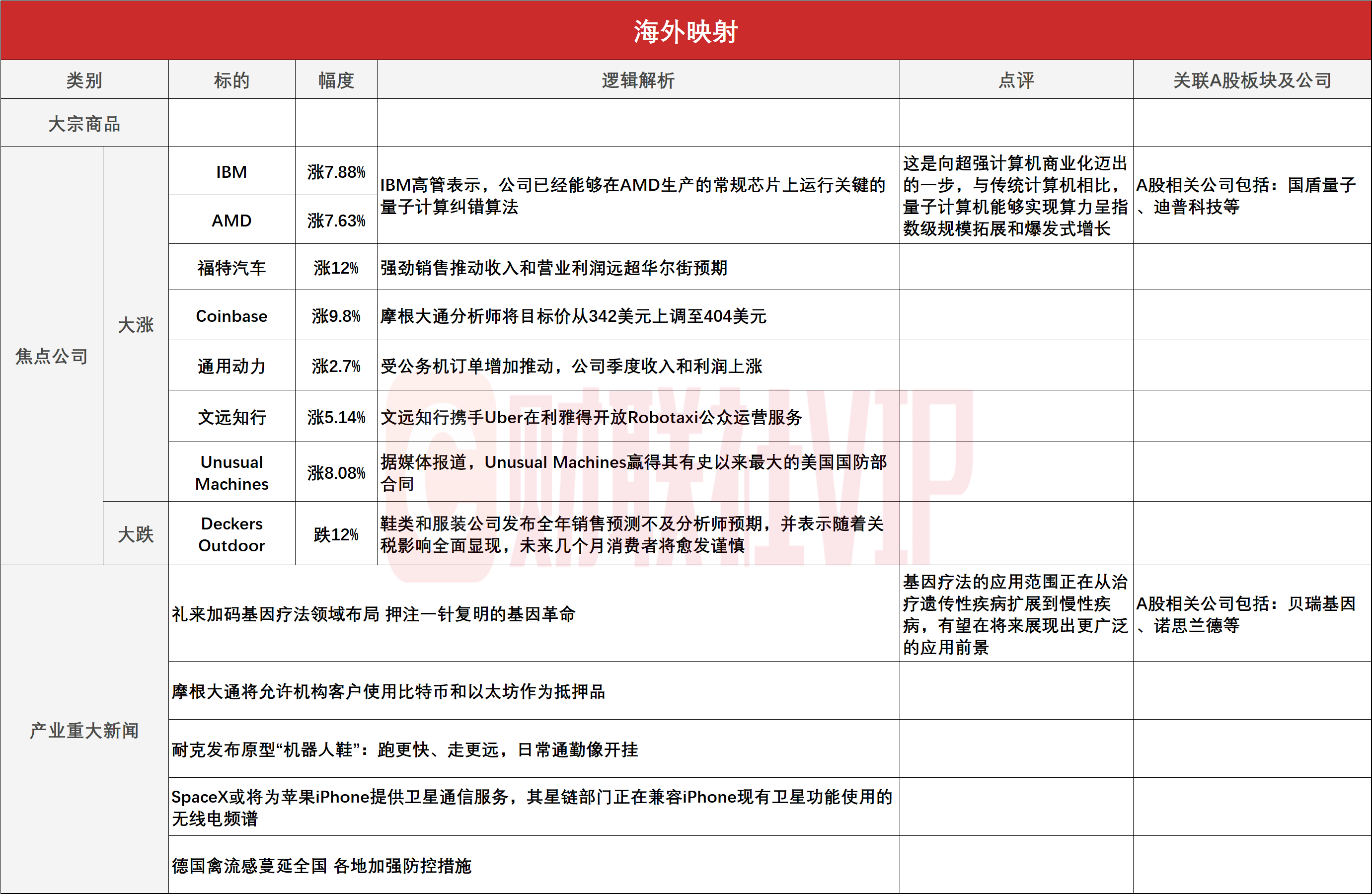 1、IBM涨7.88%,IBM高管表示,公司已经能够在AMD生产的常规芯片上运行关键的量子计算纠错算法,这是向超强计算机商业化迈出的一步,与传统计算机相比,量子计算机能够实现算力呈指数级规模拓展和爆发式增长,A股相关公司包括:国盾量子、迪普科技等;