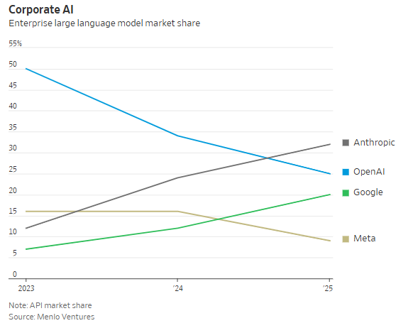门洛创投的数据还显示,Anthropic在企业整体AI应用市场份额上也领先于OpenAI,两者占比分别为32%和25%。