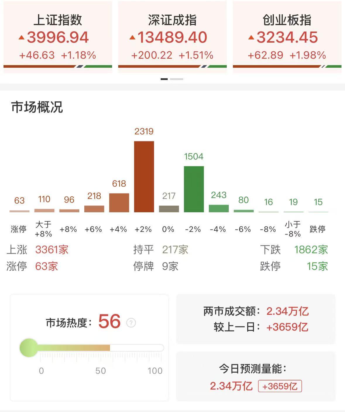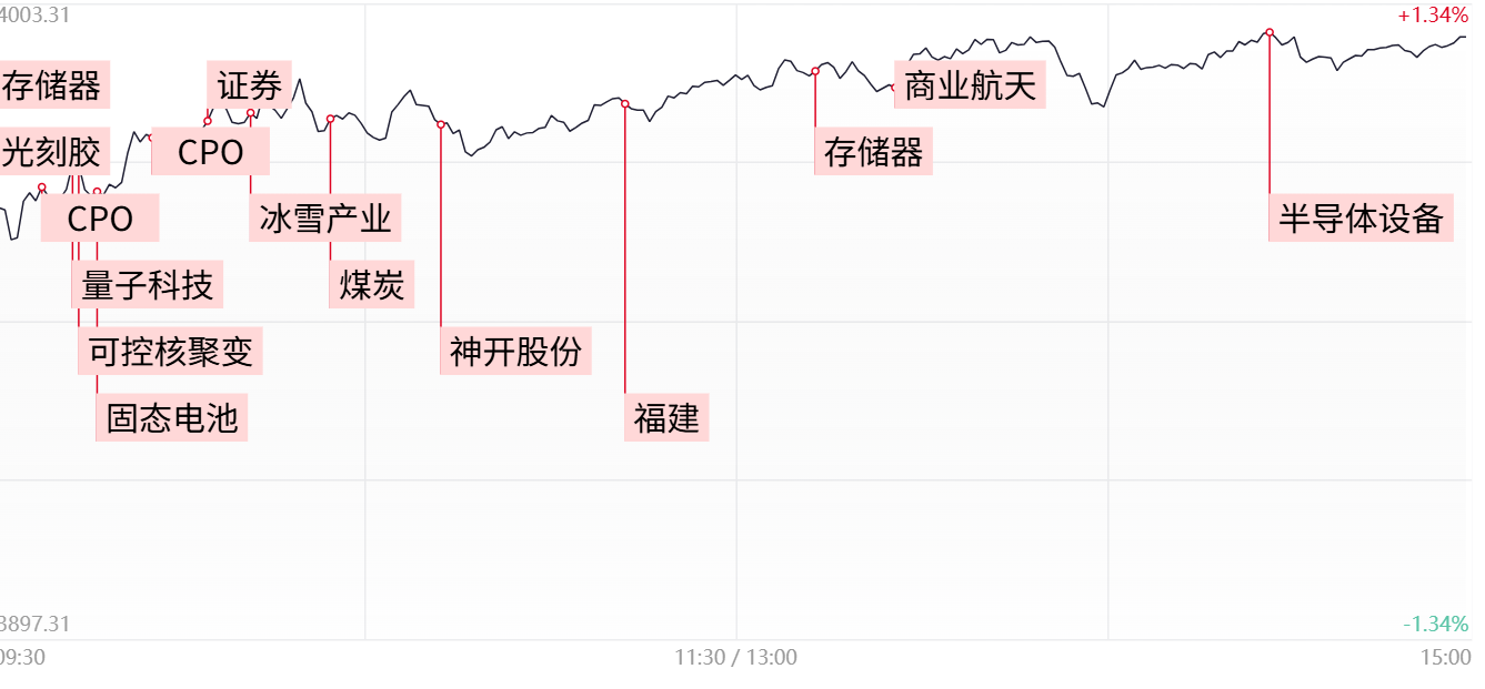 财联社10月27日讯,市场震荡上涨,沪指高开高走涨超1%,再创十年新高,盘中逼近4000点。沪深两市成交额2.34万亿,较上一个交易日放量3659亿。盘面上,市场热点轮番活跃,存储芯片概念股全天走强,德明利2连板创新高,江波龙、香农芯创等多只个股创新高,时空科技4连板。算力硬件概念股延续强势,汇绿生态6天4板创新高,新易盛、中际旭创盘中均创历史新高。核电板块表现活跃,东方钽业3天2板,安泰科技等多股涨停。下跌方面,风电板块集体走弱,海力风电大跌。截至收盘,沪指涨1.18%,深成指涨1.51%,创业板指涨1.98%。