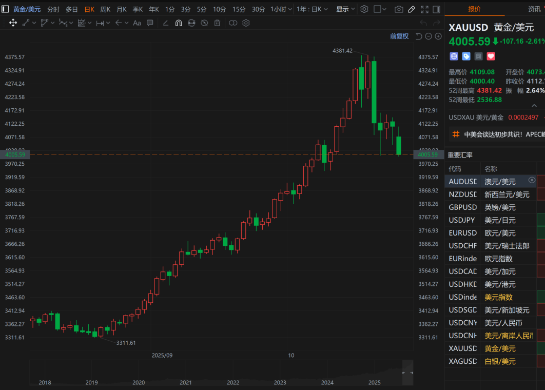 财联社10月27日电,现货黄金向下触及4000美元/盎司,为10月10日以来首次,日内跌幅扩大至2.7%。