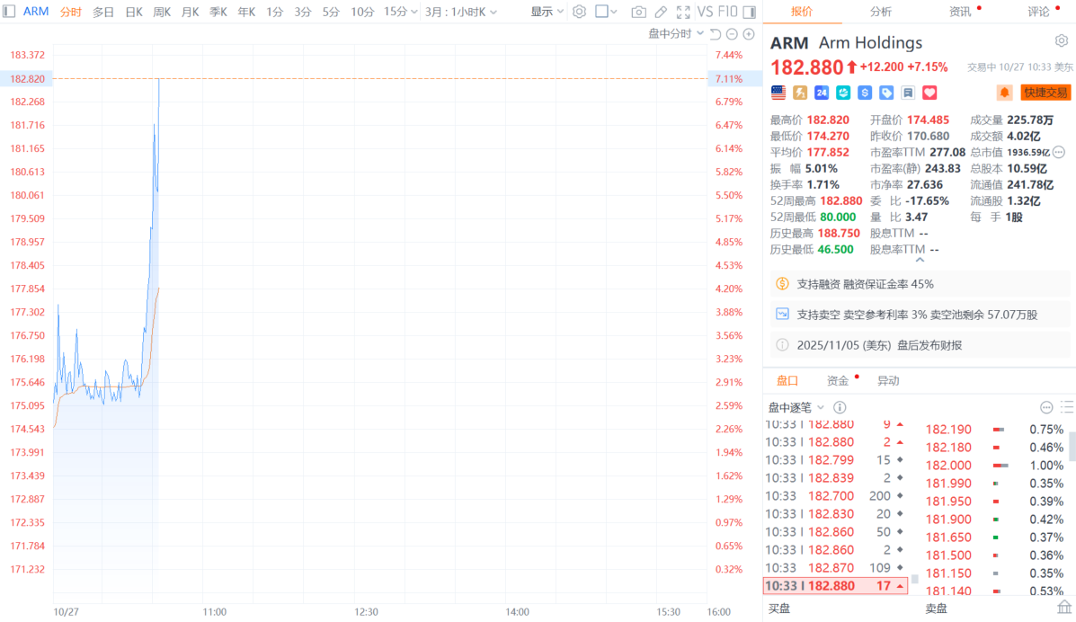 22:34:27 财联社10月27日电,ARM日内涨幅扩大至7%,升至九个月高点。