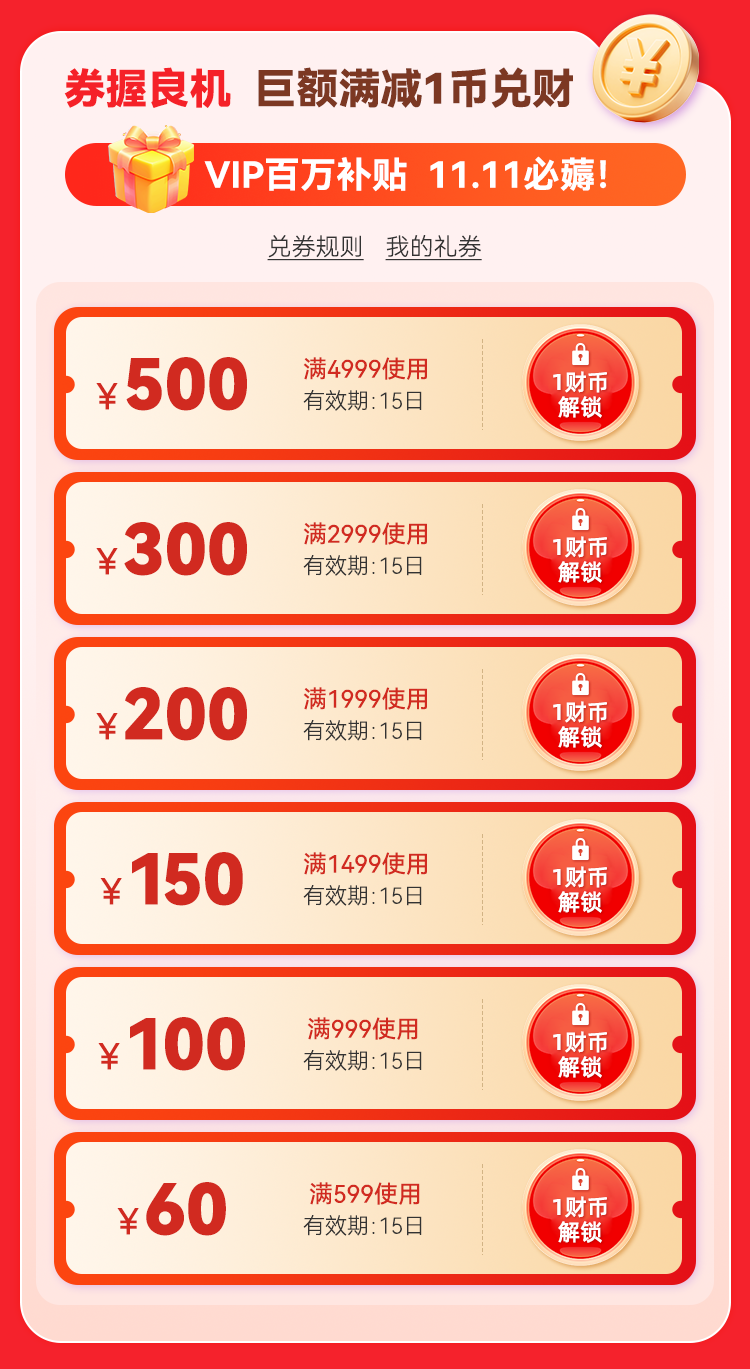 活动期间,叠加1财币兑券的大额代金券,折上再省最高500元!目前,1财币可以兑换满4999-500代金券、满1999-200代金券、满1499-150代金券、满2999-300代金券、满999-100代金券、满599-60代金券。领券后叠加活动日常折扣,到手价更惠。