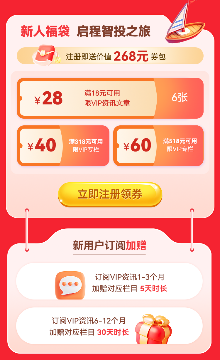 若您是财联社的新注册用户,还可额外享受「注册礼」和「首购礼」,首次注册财联社的用户加赠价值268元的新手大礼包!新手首购更享时长补贴,订阅包时段1-3个月,加赠对应栏目5天,订阅6-12个月,加赠对应栏目30天;