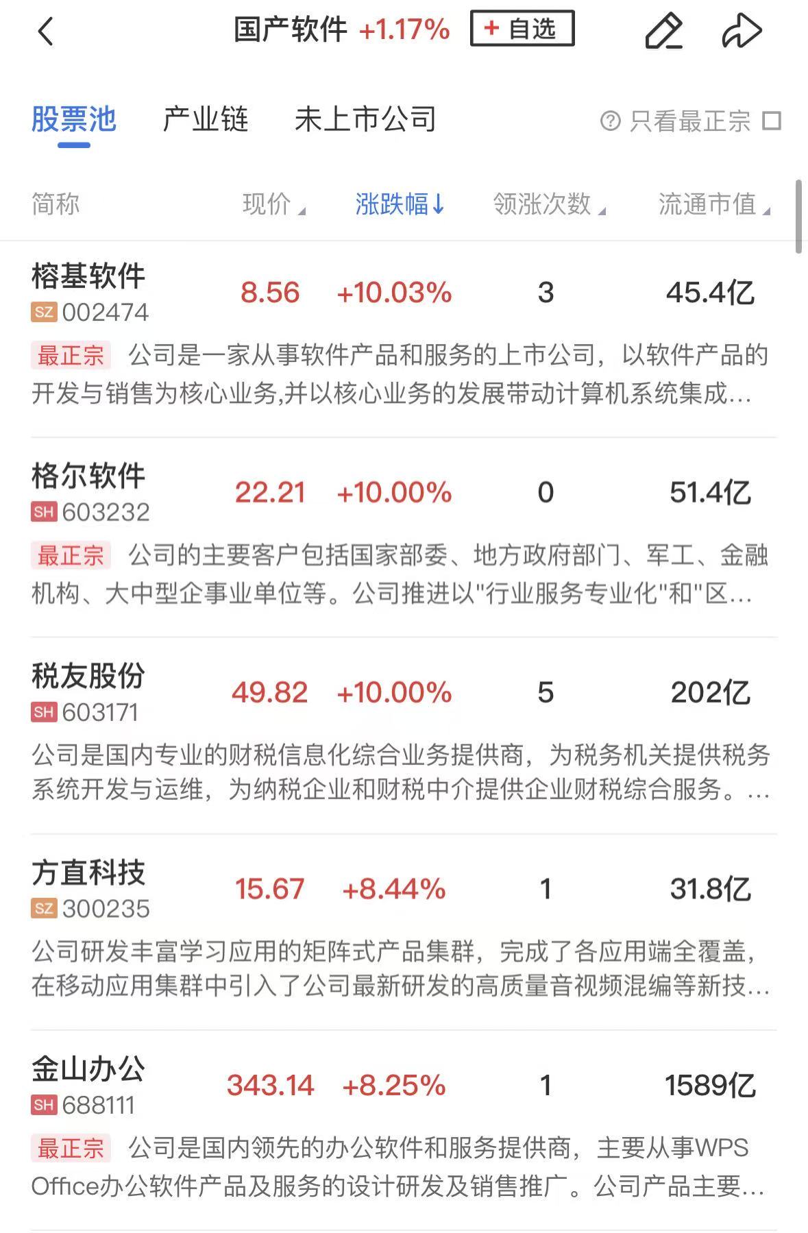 国产软件同样表现活跃,榕基软件、格尔软件双双涨停,金山办公、致远互联、网达软件等个股涨幅居前。
