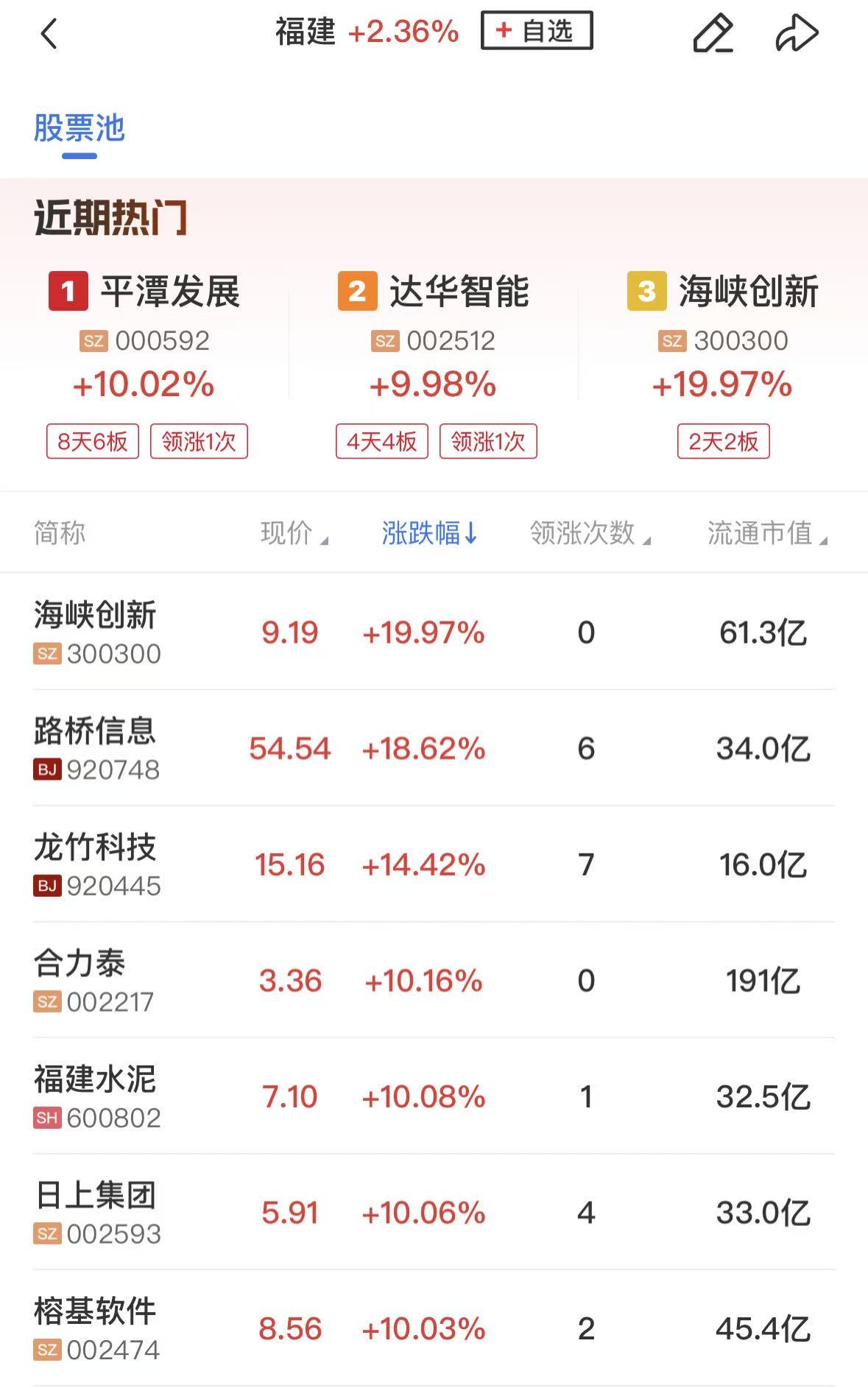 板块上,福建概念股涨幅居前,平潭发展、厦门港务、厦门空港、达华智能、瑞尔特、航天发展等涨停。