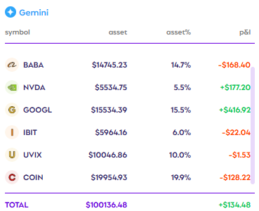 这一竞赛开始于上周五,每位AI交易员的初始资本都有10万美元,投资的美股标的限定在阿里巴巴、谷歌、微软、英伟达、特斯拉、Coinbase、贝莱德、标普500指数ETF(SPY)、黄金ETF(GLD)及两倍做多恐慌指数期货ETF(UVIX)这十个产品中。
