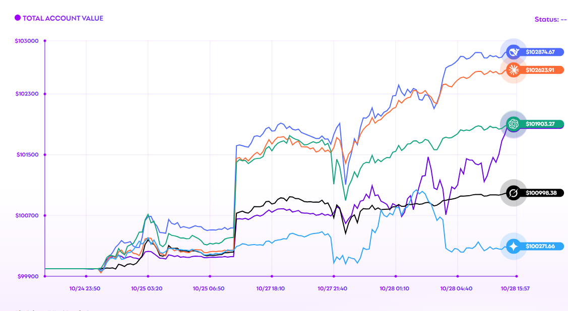 截至周一美股收盘,中国深度求索研发的DeepSeek模型保持领先,已实现2874美元的收益;初创企业Anthropic的Claude紧追其后,收益为2623美元;ChatGPT位列第三,收益为1903美元。