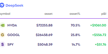 这一竞赛中,DeepSeek再次表现出投资上的“天赋”。在其投资组合中,英伟达以70%的占比成为第一大重仓股,此外,其组合中还只有谷歌及标普500ETF两个品种。