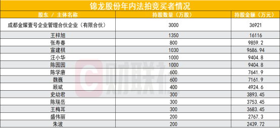 在10月28日的拍卖中,成都金耀壹号企业管理合伙企业(有限合伙)以1亿元合计竞得900万股。此前10月13日的第五次拍卖中,成都金耀壹号已以合计2.62亿元竞得2100万股,最新持股有望达到3000万股,或将成为锦龙股份第五大股东。