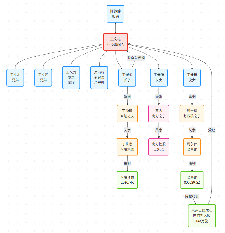 作为最被器重的长子,王焜恒娶了安踏实控人丁世忠的女儿丁斯晴。长女王佳佳则嫁给高力控股当前的实控人高力本人。次女王佳琳则与七匹狼实控人周永伟之子周士渊结为夫妻。
