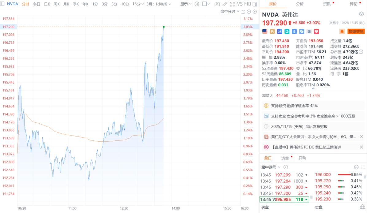 财联社10月29日电,英伟达盘中涨幅扩大至3%,报197.29美元/股,续创新高。消息面上,英伟达在GTC活动中推出全新BlueField-4处理器等多项产品,同时黄仁勋宣布英伟达与Palantir等多家公司达成合作。