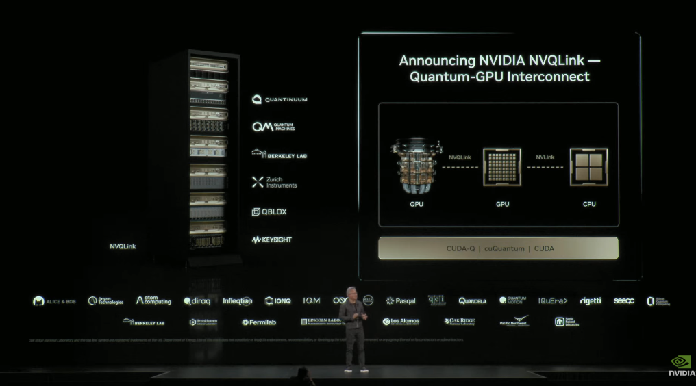 英伟达同时展示了基于CUDA‑Q核心构建的NVQLink,用于连接传统GPU和量子计算机,共同加速量子计算。目前的量子计算对环境噪声高度敏感,且可用性有限。因此需要基于GPU的超级计算机承担起量子处理器的部分负载,支持量子纠错所需的控制算法。
