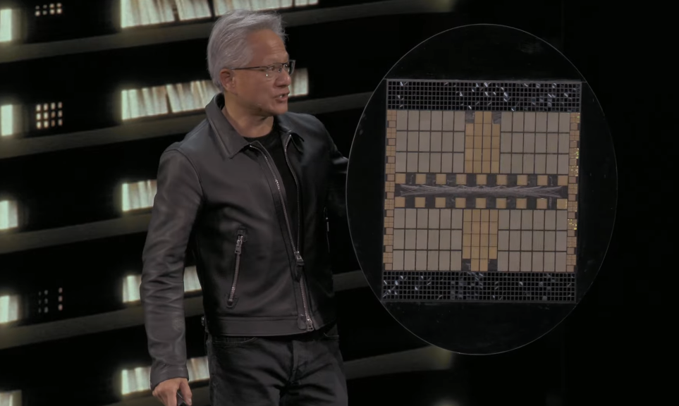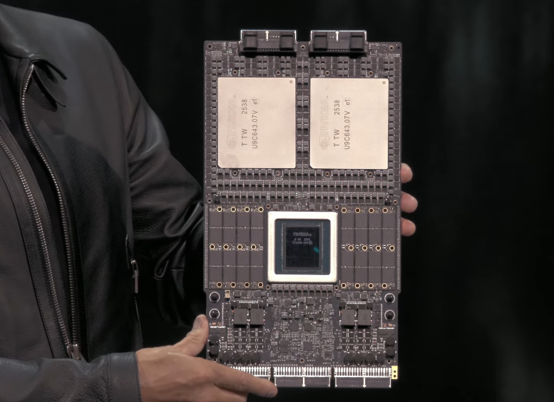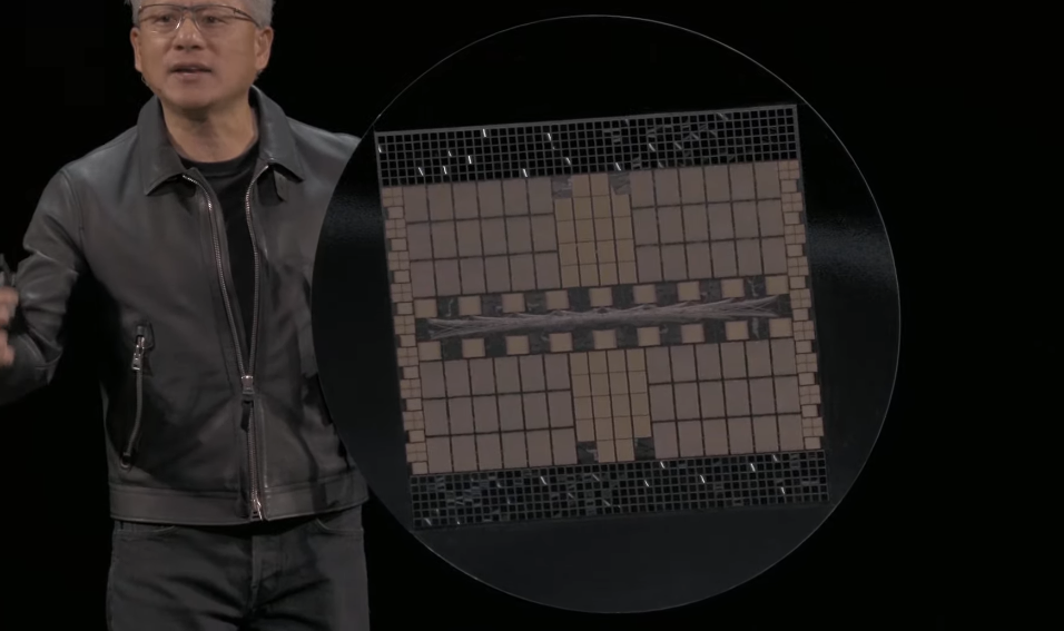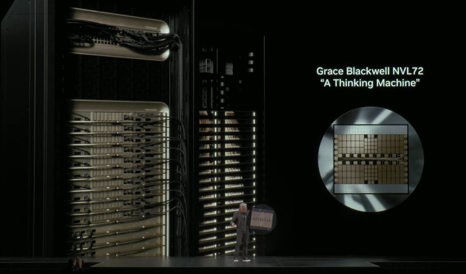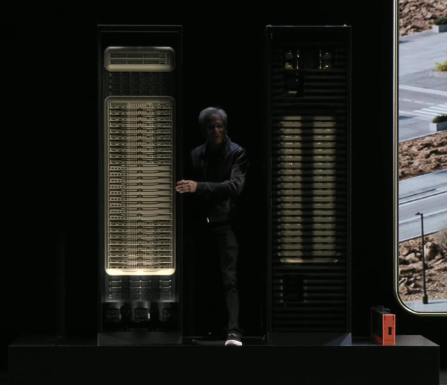 作为演讲的保留节目,黄仁勋又展示了他的“芯片盾牌”——今天的盾牌由NVLink连接的72个GPU构成。