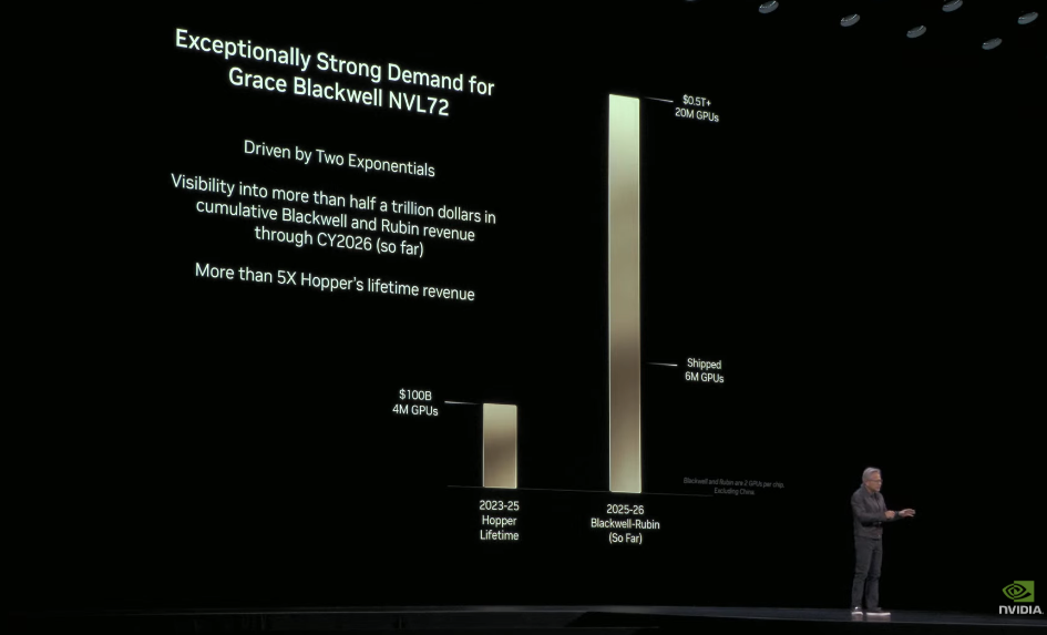 作为刺激股价表现的环节,黄仁勋在现场宣布,截至2026财年末,公司账上已经堆了超过5000亿美元订单。
