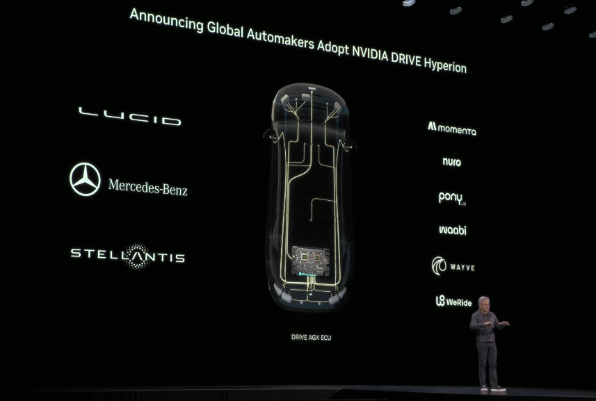 作为演讲的压轴环节,黄仁勋宣布推出NVIDIA DRIVE AGX Hyperion 10,这是一套参考级量产计算平台与传感器架构。英伟达宣称,这套系统是面向“L4级自动驾驶”的通用平台,包括14个高清摄像头、9个雷达、1个激光雷达和12个超声传感器,以及两台基于Blackwell架构的车载DRIVE AGX Thor平台。