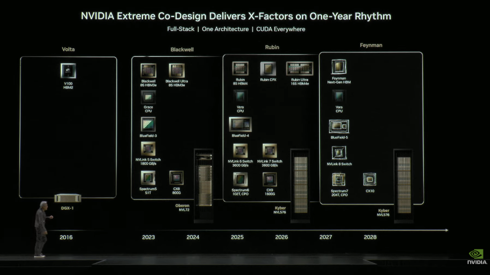 他也在现场展示了英伟达截至2028年的GPU路线图,和下一代Vera Rubin架构芯片的样机。这款产品可能要到明年此时或更晚一些才能量产发货。