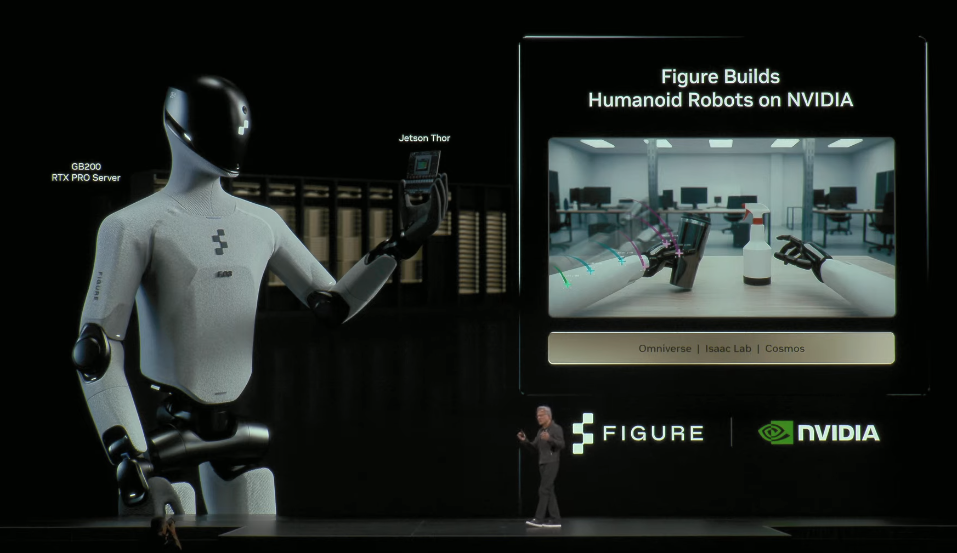 在备受投资者关注的“物理AI”方面,黄仁勋的演讲主要放在Omniverse数字孪生技术上,包括利用该技术构建现代工厂,以及训练和打造机器人。其中机器人初创公司Figure宣布与英伟达开展合作,加速下一代人形机器人研发。Figure正在使用英伟达加速计算构建其Helix视觉-语言-动作模型,并采用Isaac平台进行仿真和训练。