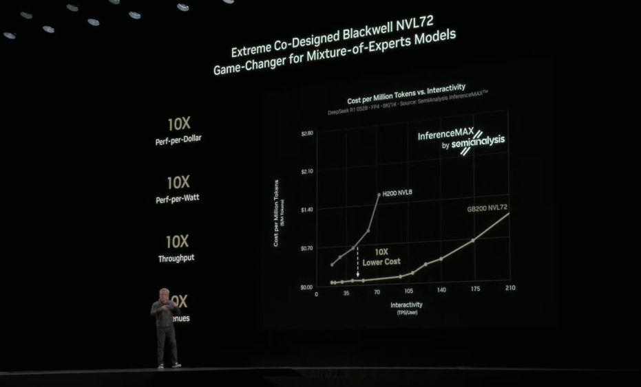黄仁勋特别强调,通过在更多GPU之间更好地分配推理任务,GB200 NVL72 AI超级计算机的性能提高了10倍,同时运行成本也降低了10倍——AI正变得对所有人更加可及