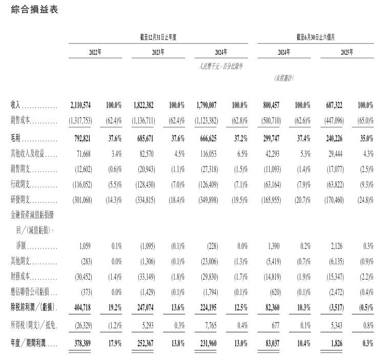 值得注意的是,富瀚微的整体毛利在总收入下降后总体呈下降趋势。2022年至2024年的整体毛利率保持相对稳定在37%左右,但在2025年上半年下降至35%,主要原因是价格竞争激烈,其中智能物联网及智能视频产品线尤为突出。