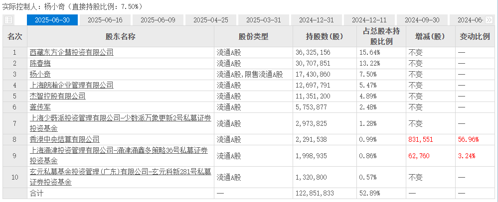 杰智控股此次减持是其年内第二次显著股权变动。2024年12月,该股东曾通过大宗交易及集中竞价方式减持217.34万股,叠加总股本被动稀释,持股比例降至4.99998%,退出5%以上股东行列。而在2025年6月,另一持股5%以上股东上海朗瀚企业管理有限公司也完成减持,累计减持374.35万股,持股比例从7.15%降至5.52%。